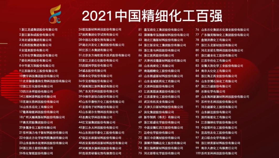 4月27日,“2021精细化工产业峰会暨中国精细化工百强发布会”以线上方式举行。会议发布了“2021中国精细化工百强”榜单,新和成股份公司蝉联榜单第二。