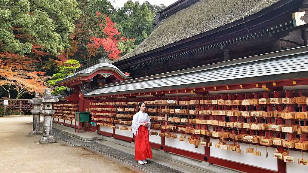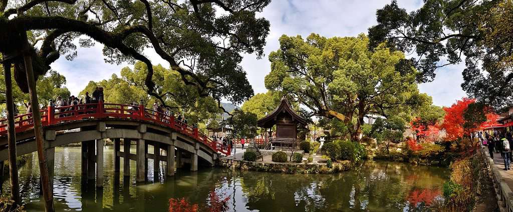 If you wish to jazz up your photos in Dazaifu, you can rent a kimono or yukata here for the evening as the cosy town offers a perfect back drop.Once you’ve passed the shops, you will find a torii gate that marks the entrance of the shrine. Leading up to the shrine, you will meet a series of two arched bridges and islands representing the past, present and future. They will then lead you to the walled courtyard of the shrine.